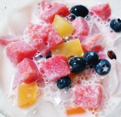 저는 오디와 포도도 넣어봤는데 색깔도 예쁘고 맛도 좋았습니다. 오디는 먹기 직전에 넣어주시면 보라색으로 변하지 않습니다.