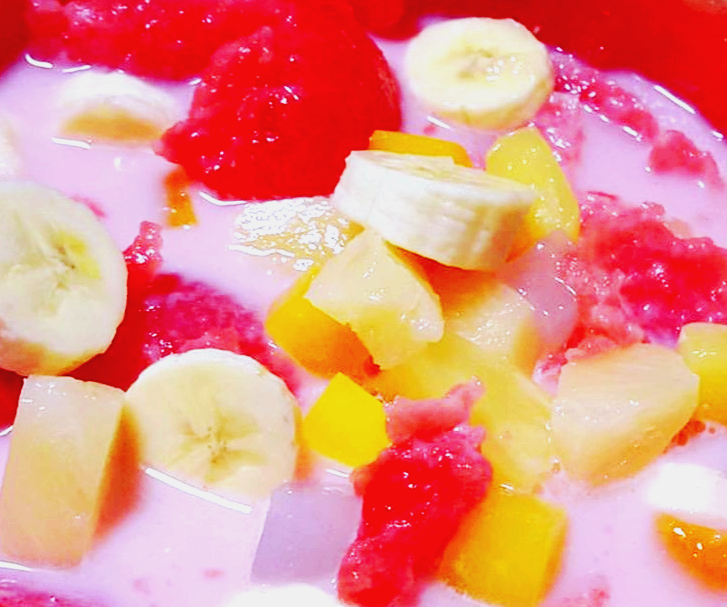 6. 과일 그릇에 딸기우유를 부어주고 잘 섞어줍니다.