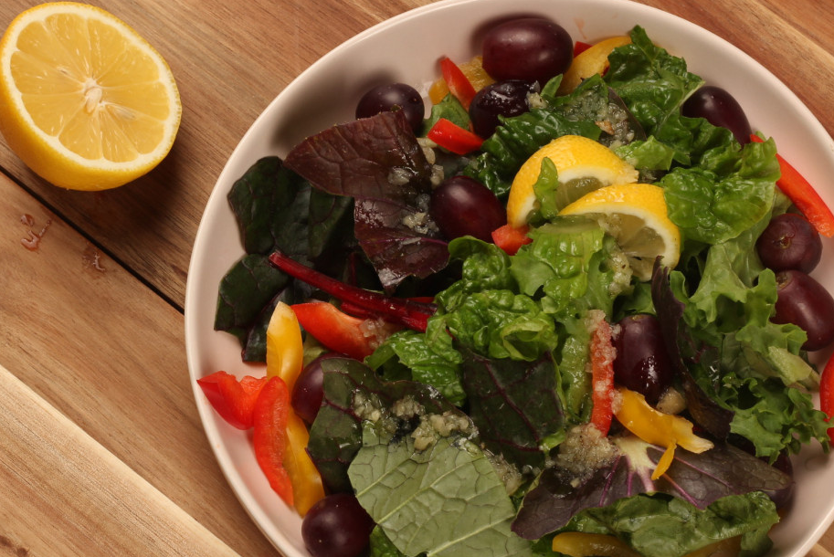 별도의 그릇에 올리브 오일, 레몬즙, 소금, 후추를 섞어 준 후 야채 위에 뿌려줍니다.