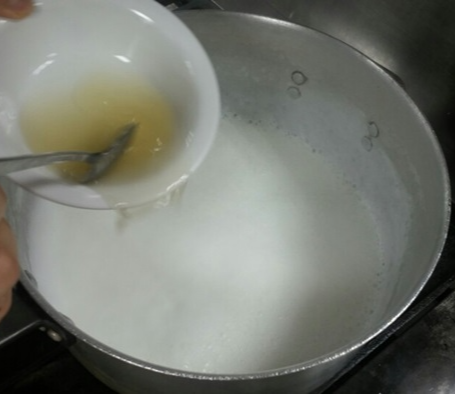 2.우유가 끓기 시작하면 식초를 조금씩 추가하면서 저어줍니다.