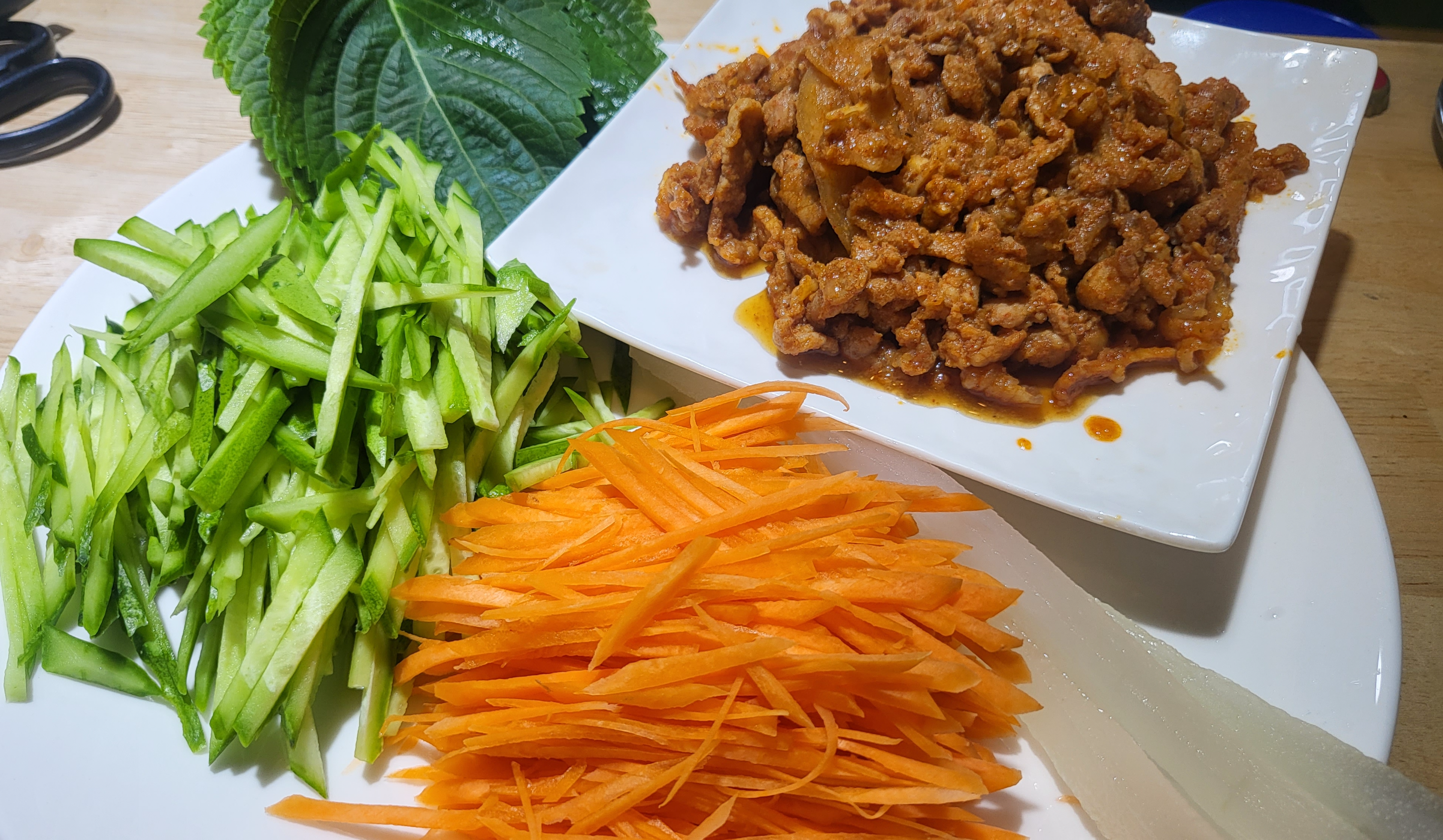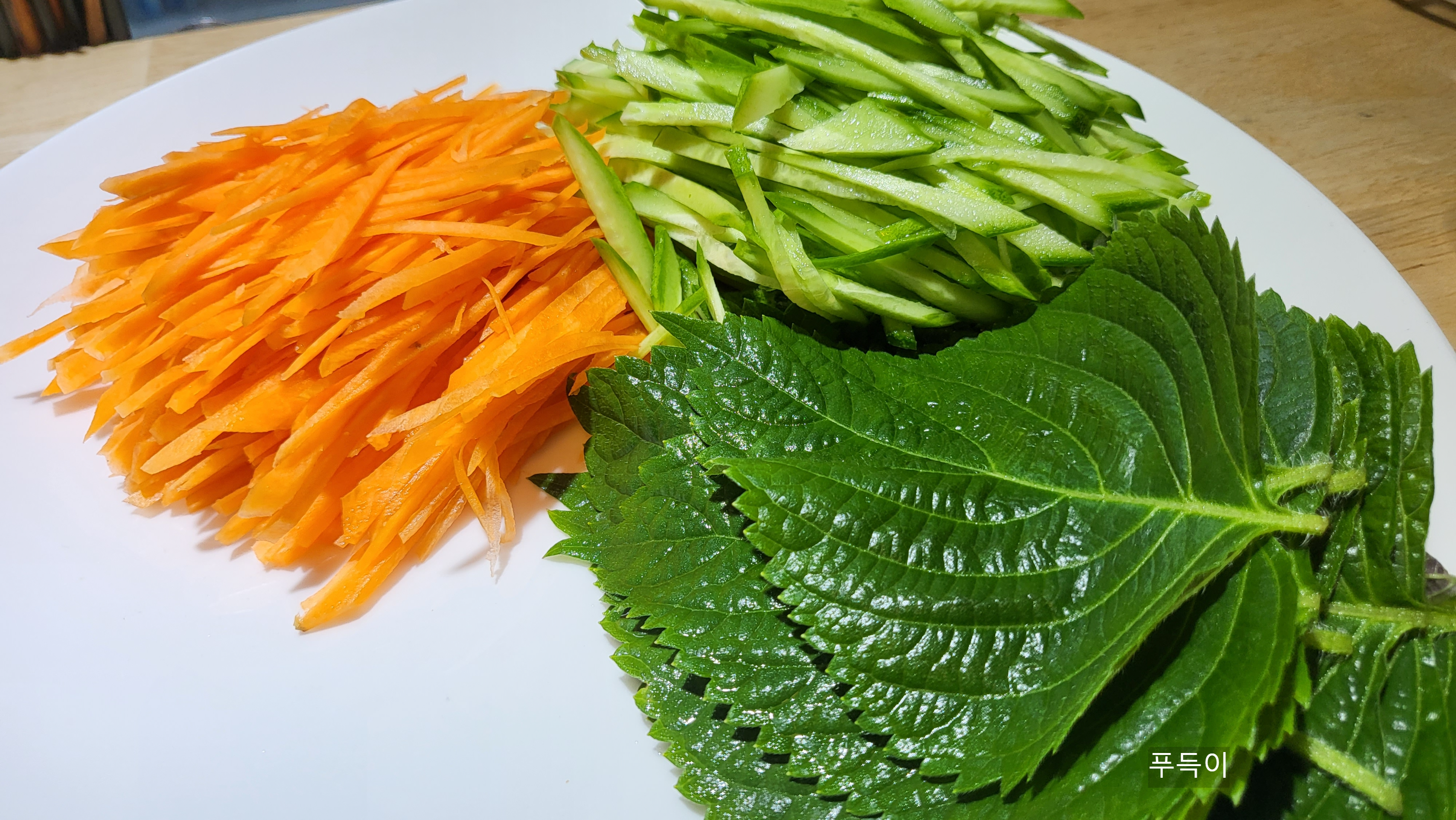 3. 오이, 당근은 가늘게 채 썰어 준비한다. 깻잎은 잘 씻어 물기를 빼둔다.