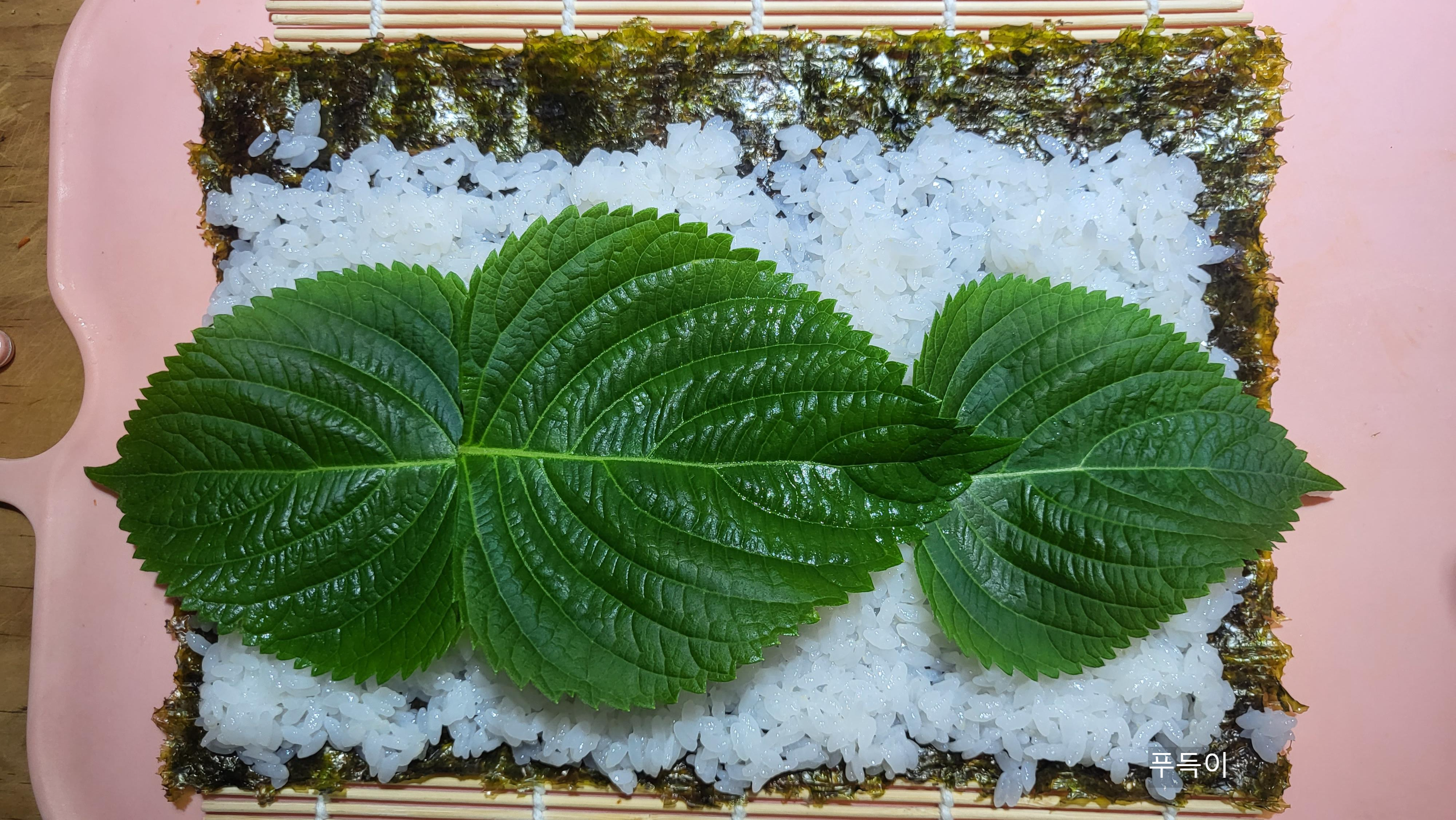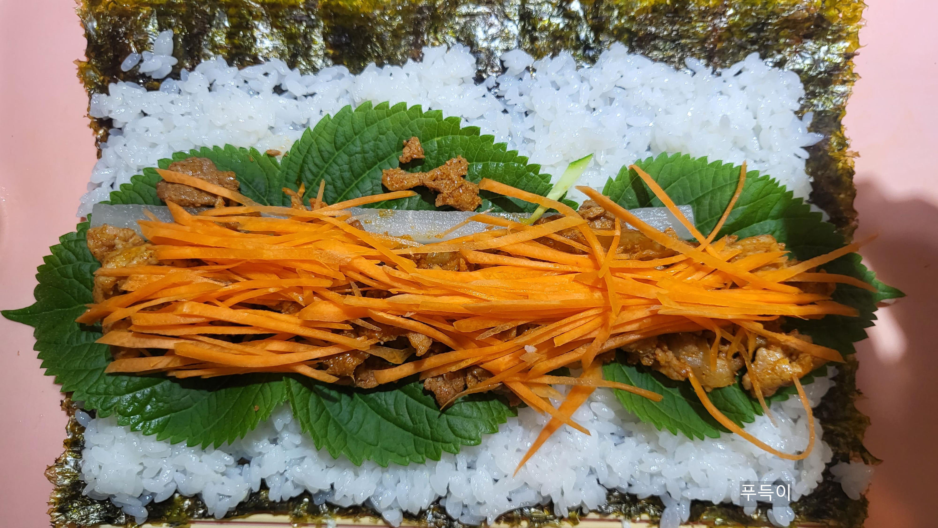 6. 김 -> 밥-> 깻잎-> 단무지-> 제육볶음-> 당근, 오이