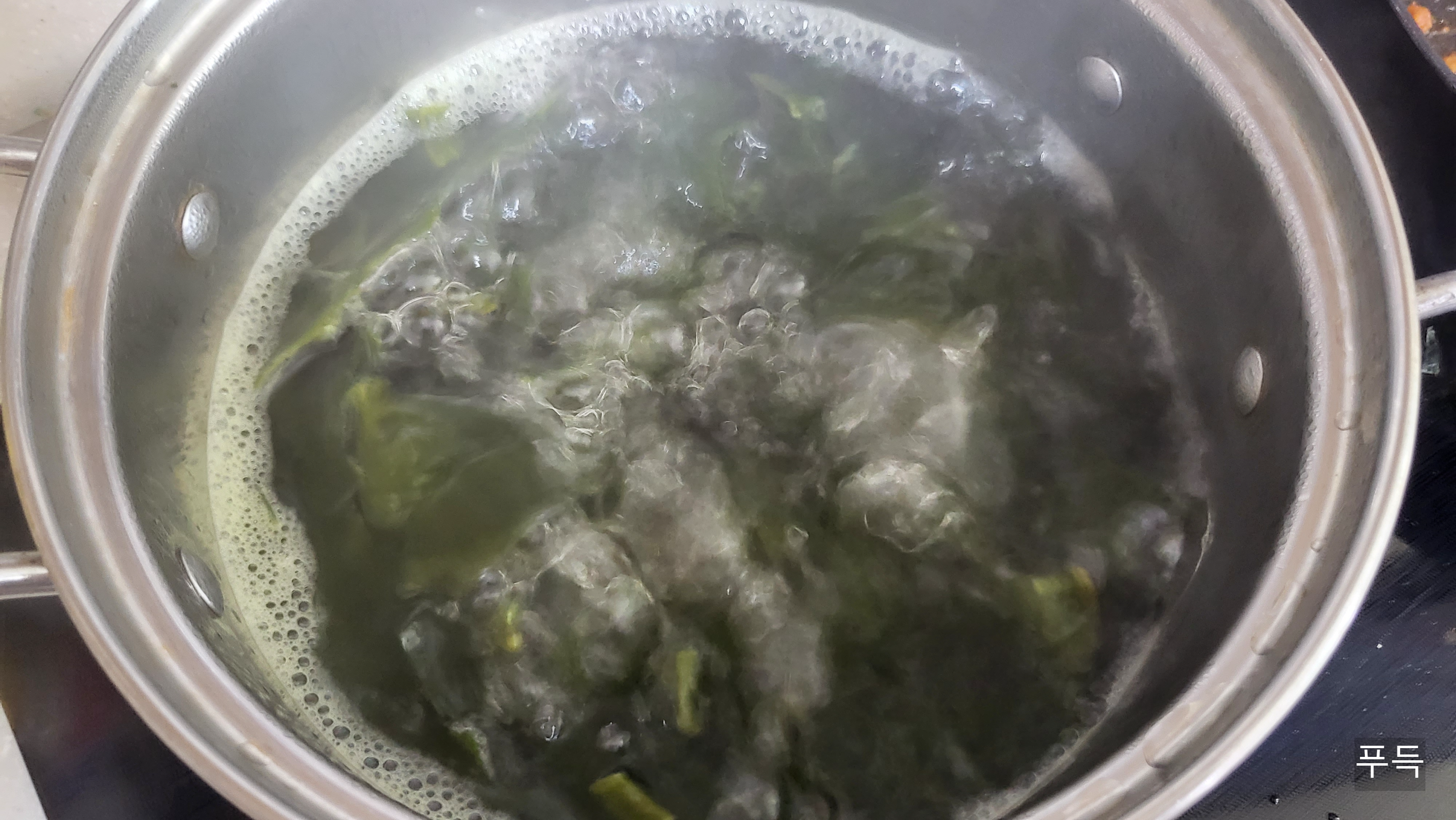 2. 불린 미역을 물에 넣고 끓인다.