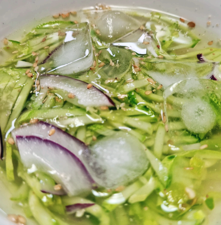 6. 큰 그릇에 얼음을 넣고 물을 부어 줍니다. 이것이 오이냉국의 국물입니다.