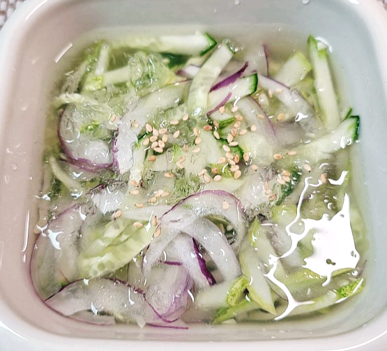 7. 국물에 양념한 오이와 양파를 넣고 잘 섞어 줍니다.