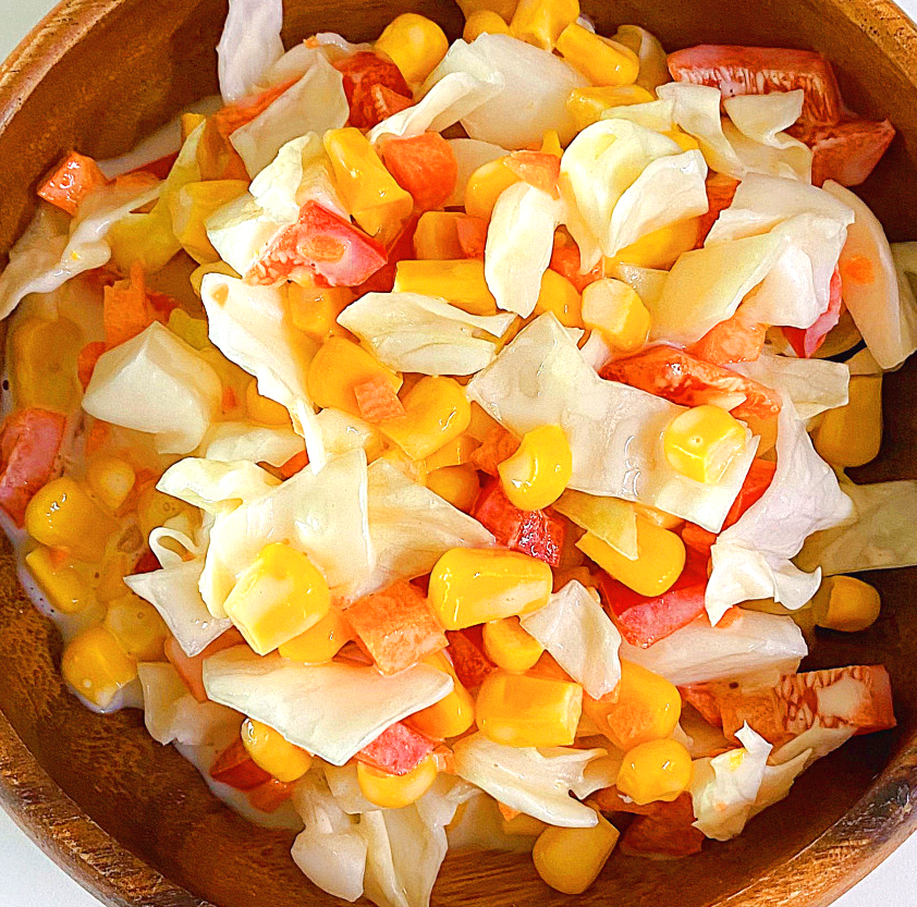 4. 볼에 양배추와 파프리카를 담고 캔 옥수수 5큰 술을 넣어줍니다.