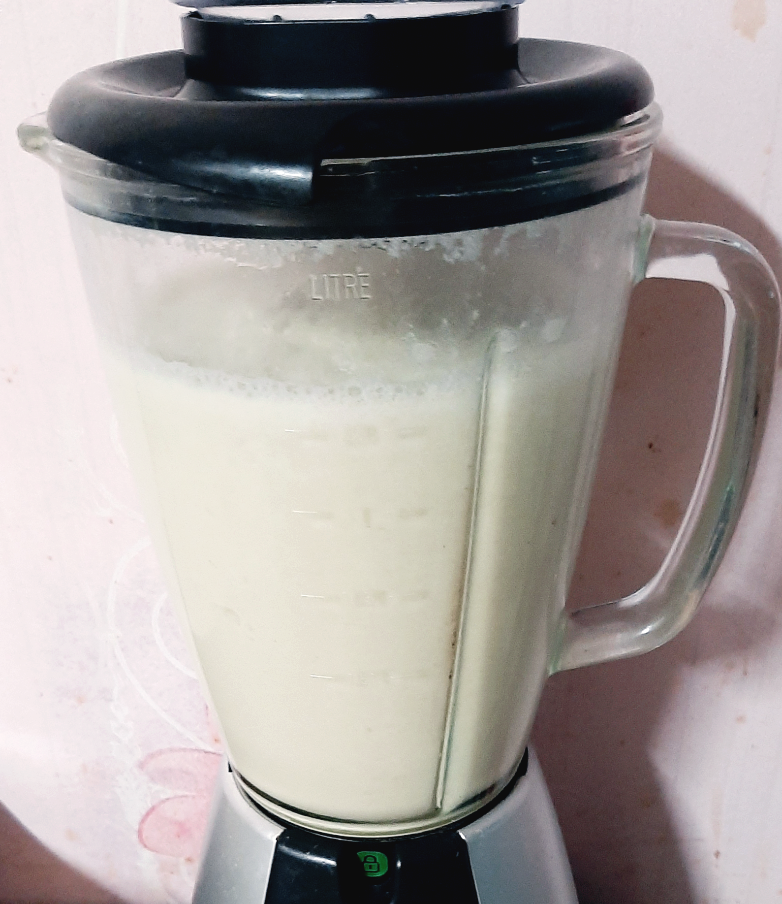 5. 믹서기를 틀어서 콩과 설탕이 잘 섞이도록 합니다. 섞을 때 너무 오래 하면 콩물이 따뜻해지므로 주의하세요.