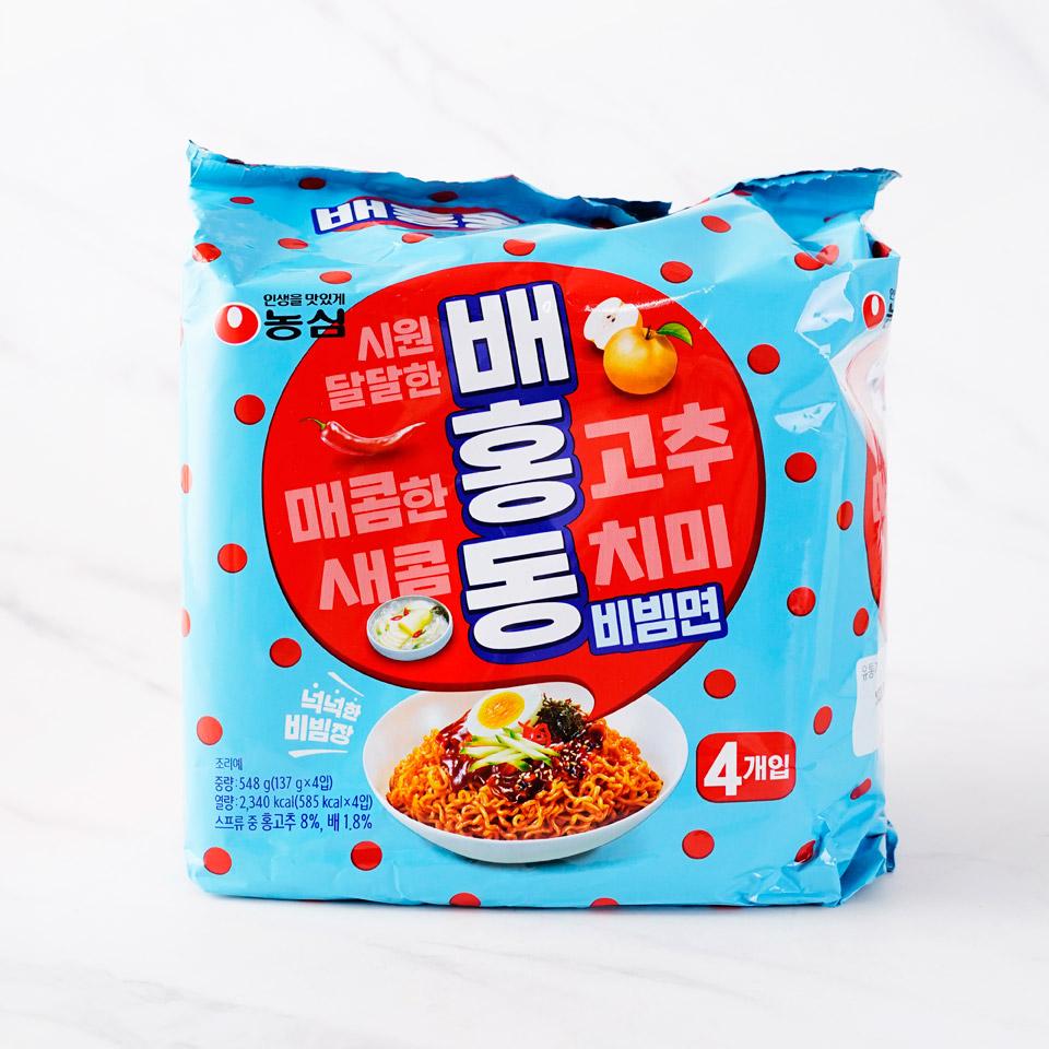 배홍동 비빔면은 개그맨 유재석이 광고하는 제품으로, 비빔장과 고소한 참깨토핑이 들어있습니다.