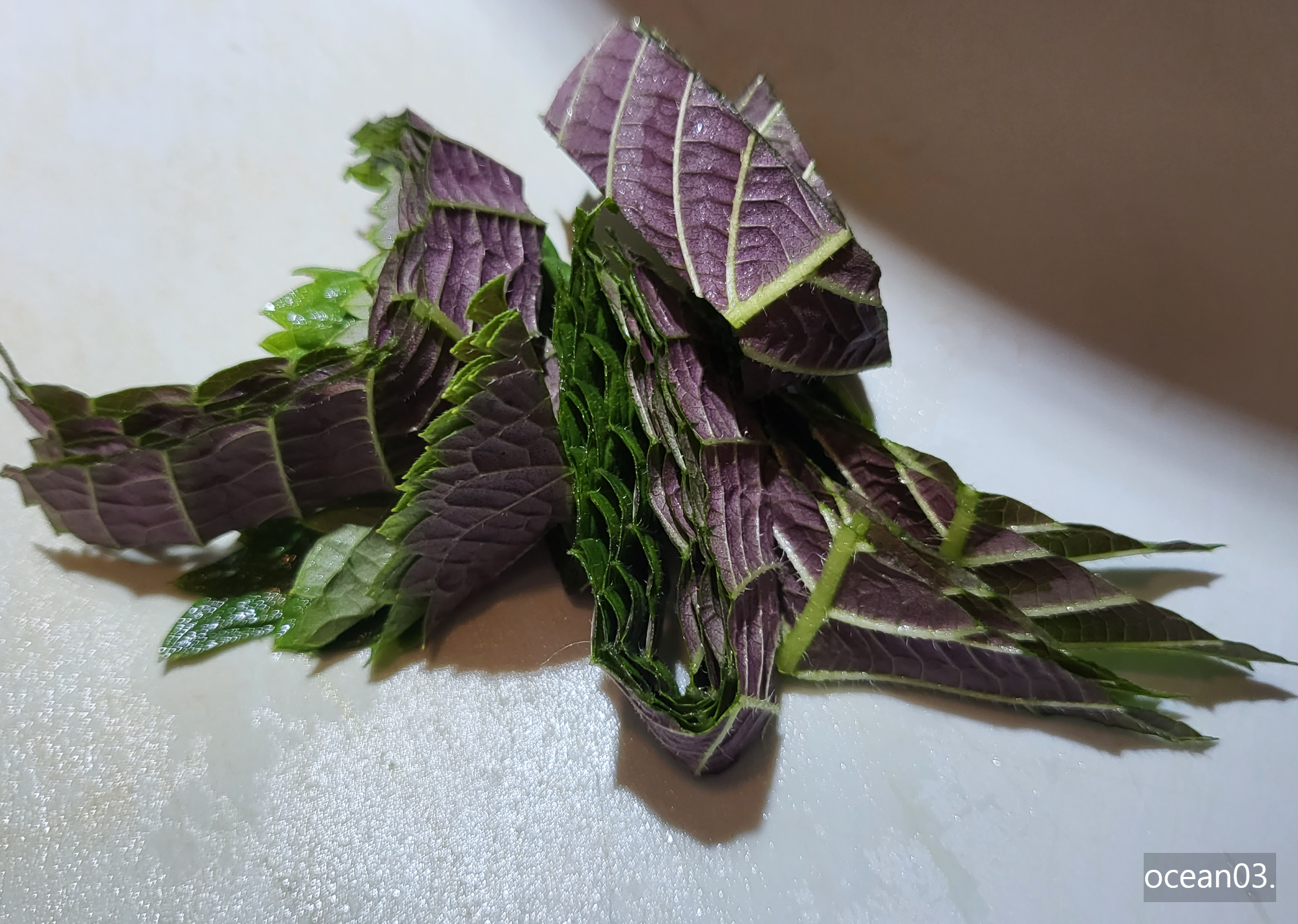 - 오징어를 미림과 함께 재워두고 야채를 썬다. 깻잎은 장식용으로2 장은 가늘게 채 썰고, 나머지는 그냥 썰어 놓는다.