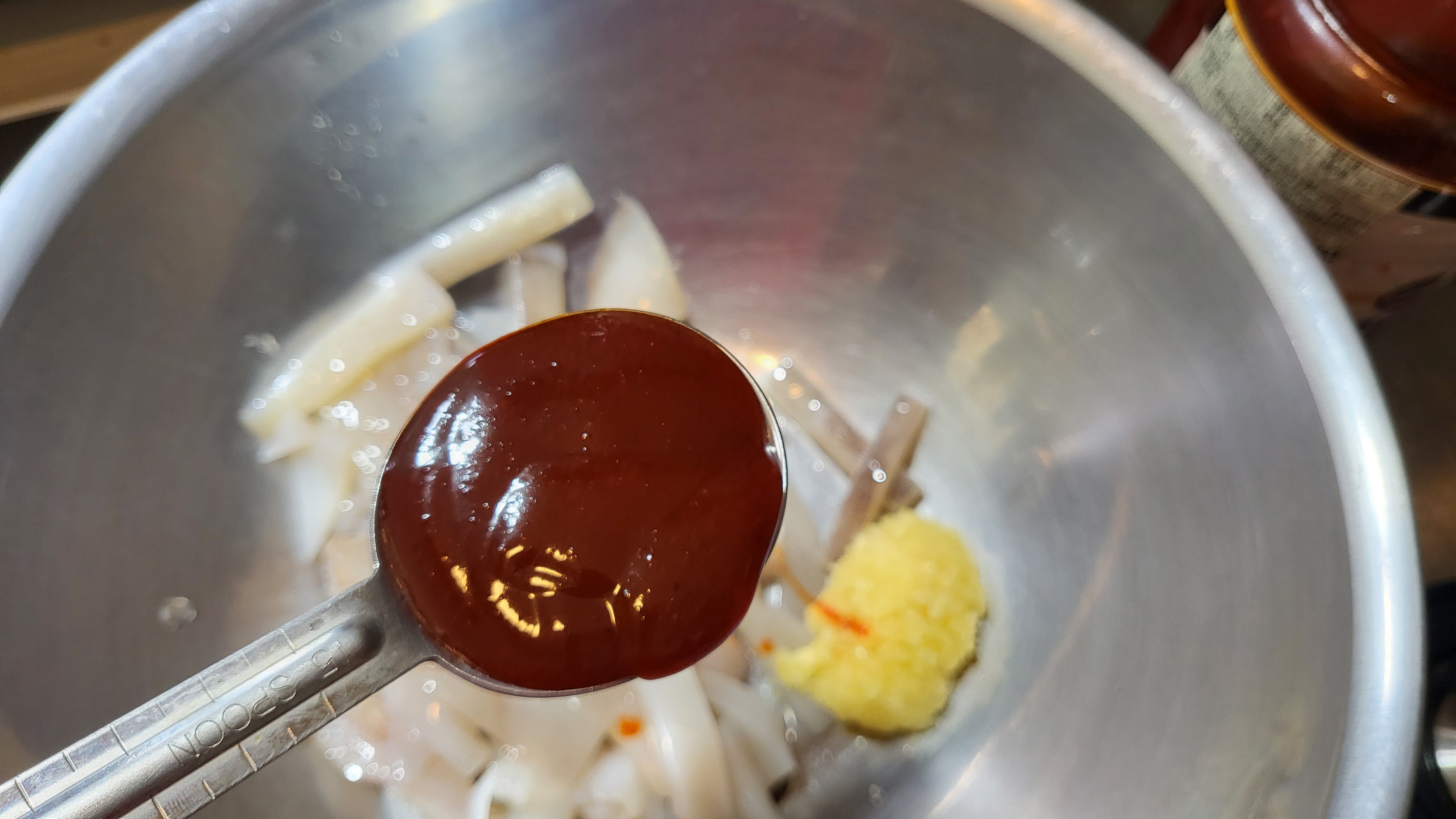 - 오징어를 잘라서 시판 볶음 양념장 2스푼 반과 마늘 한 스푼을 넣고 잘 재워둔다.
