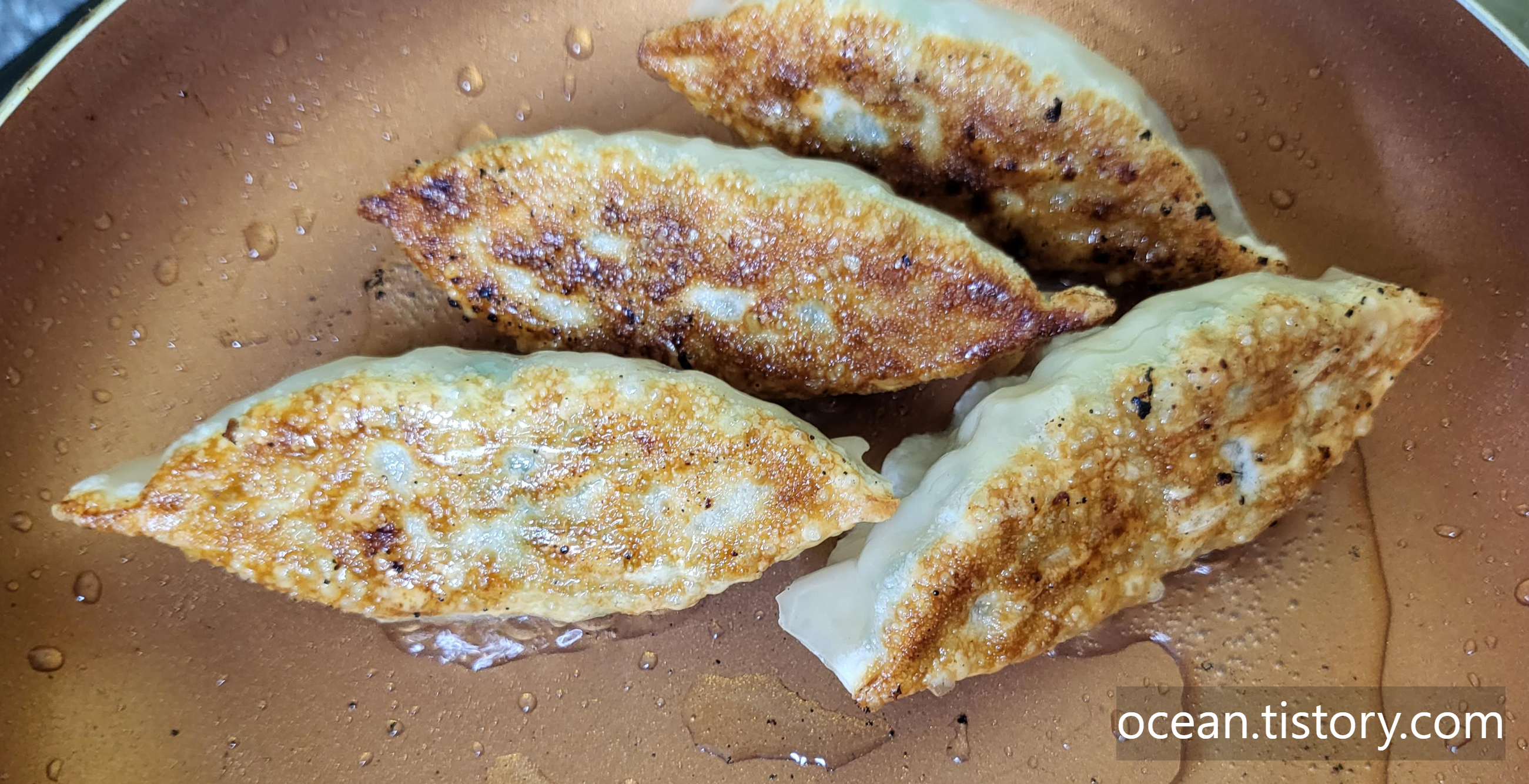 비비고 왕교자 튀김만두를 냉동 상태 그대로 기름을 두른 프라이팬에 얹어서 처음에 중간불에서 지진다.