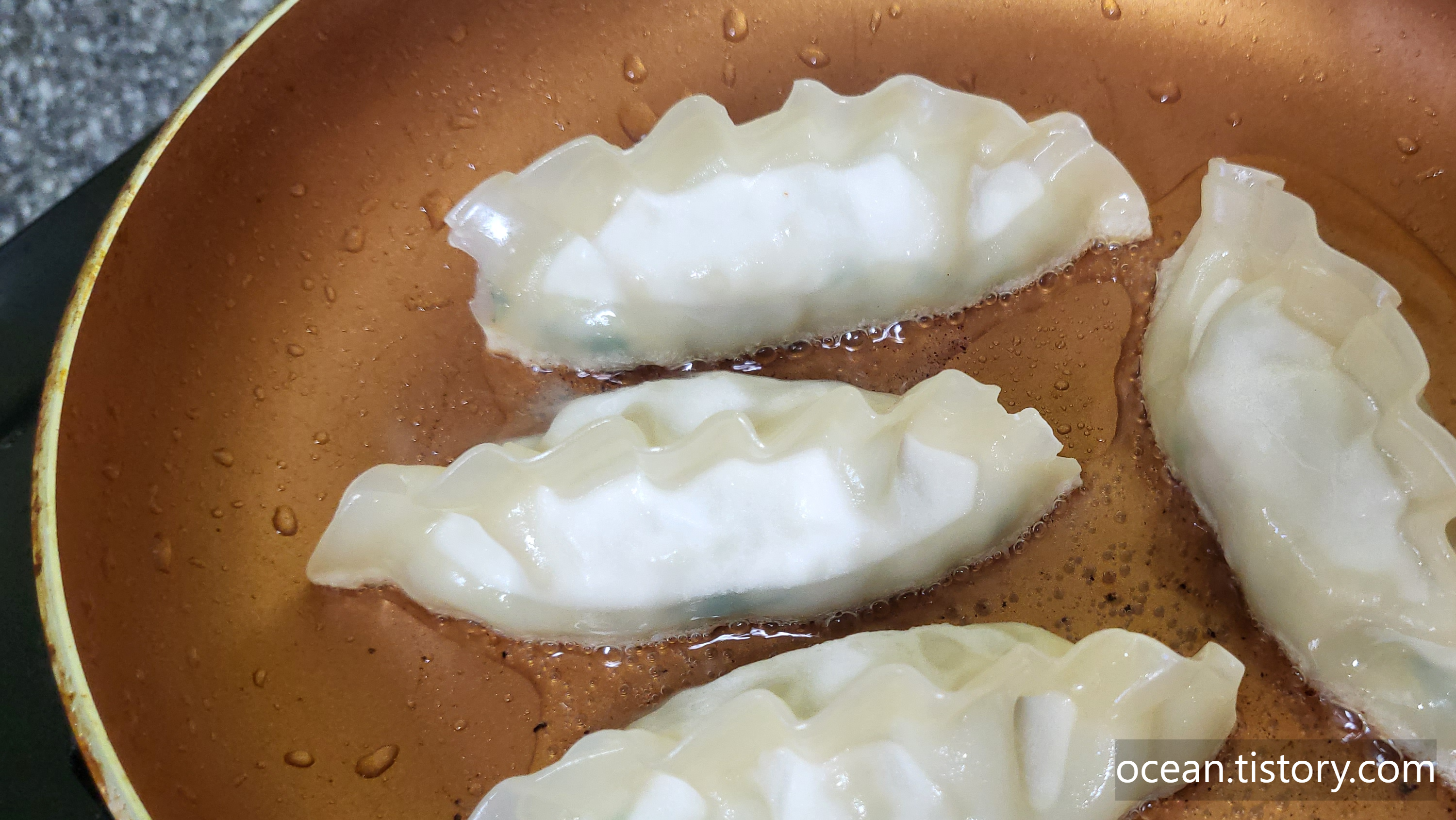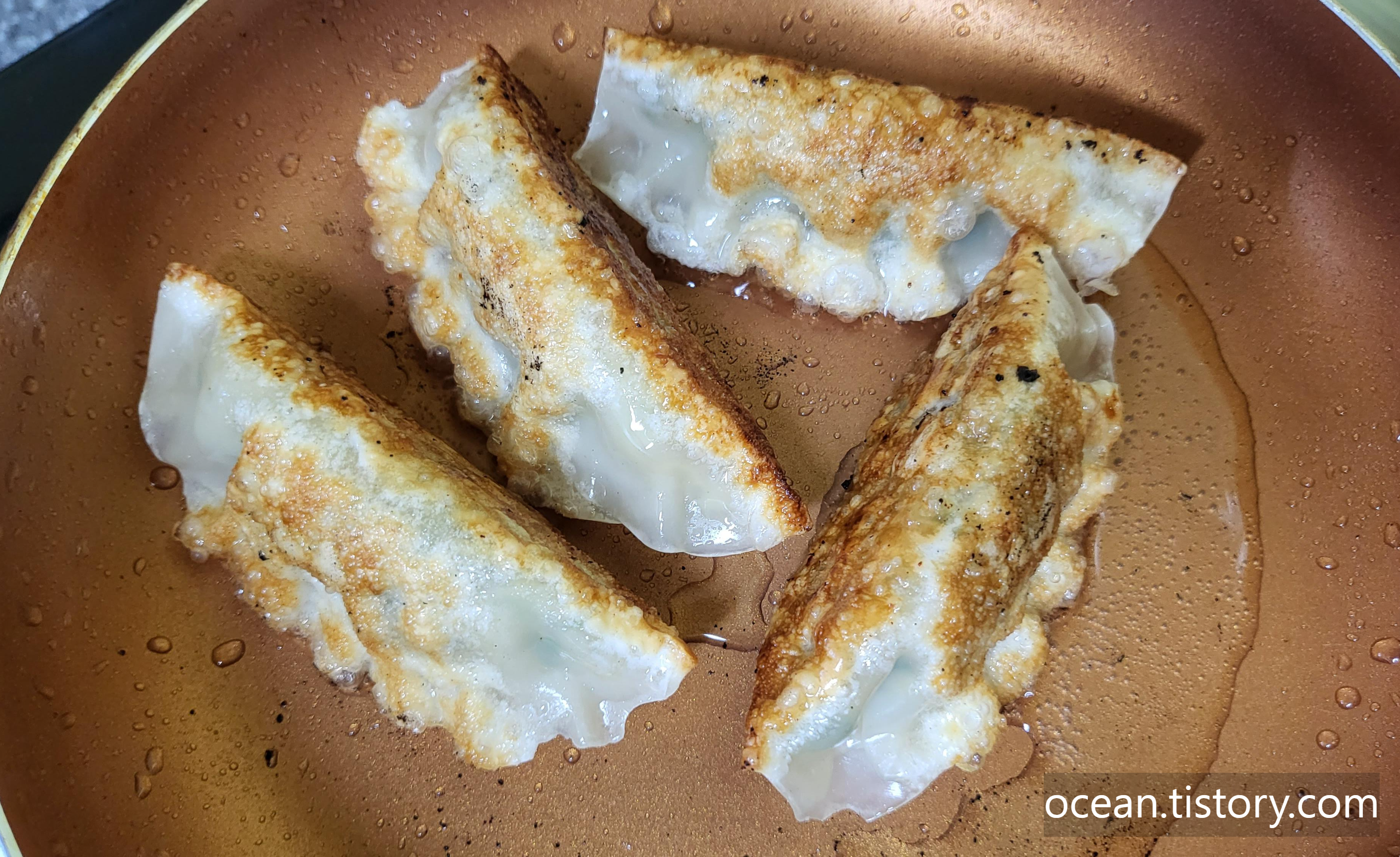비비고 왕교자 튀김만두를 냉동 상태 그대로 기름을 두른 프라이팬에 얹어서 처음에 중간불에서 지진다.